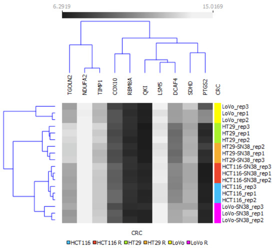 Hierarchical clustering analysis of CRC cell lines using mRNA expressions of top networking DEGs from FOLFIRI-resistant patient cohort. The expression values between corresponding irinotecan-resistant and parental CRC cell lines are presented in grayscale; black represents low and white represents high expression values (6.29–15.02). A bidirectional hierarchical clustering heat map was visualized using the Orange data visualization platform.
