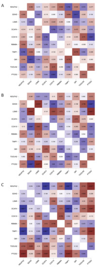 To analyze the mutual changes between different DEGs, we correlated the mRNA expression profiles of DEGs and the highest networking proteins. A Pearson correlation matrix was performed, as shown in Figure 6. This analysis showed that, in LoVo (pooled parental and the respective SN-38-resistant variant), similar to the patient samples, most of the top five upregulated DEGs (NDUFA2, SDHD, LSM5, and DCAF4) presented positive correlations (yet not statistically significant in all cases). COX10 was positively correlated only with NDUFA2 and DCAF4. Similar to the patient samples, a negative correlation was observed among RBM8A, TGOLN2, and PTGS2. In the cases of HT29 and HTC116, the cell line data were ambiguous, as NDUFA2, SDHD, LSM5, DCAF4, COX10, RBM8A, TIMP1, QKI, TGOLN2, and PTGS2 presented mixed correlations with one another.