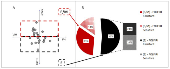 EMT phenotypes of FOLFIRI-resistant and -sensitive patients. Patient samples (n = 21) from GSE62080 were attributed to two groups, strongly epithelial (E) and partially mesenchymal (E/M), based on the mRNA levels of four primary EMT markers, E-cadherin (CDH1), N-cadherin (CDH2), vimentin (VIM), and fibronectin (FN), using Orange software (A). Sample distribution among E and E/M groups (B).