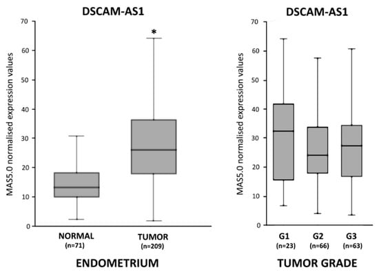Expression of lncRNA DSCAM-AS1 in endometrial tissues as assessed by analysis of GEO open-source data using the online platform http://r2.amc.nl. Left panel: expression in normal endometrium (n = 71) (GEO ID: GSE51981) and endometrial adenocarcinoma (n = 209) (GEO ID: GSE2109). DSCAM-AS1 levels are shown as normalized expression values using the MAS5.0 method (Affymetrix). Right panel: expression in endometrial cancer grading subgroups G1, G2 and G3 (GEO ID: GSE2109). Shown graphs are box and whisker charts. Boxes represent the upper (Q3) and the lower quartile (Q1), and the line indicates the median of lncRNA expression values. The ends of the whisker are set as 1.5 × IQR above Q3 or below Q1. * = p < 0.01.