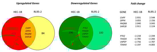 As we observed both DSCAM-AS1 to be overexpressed in endometrial cancer tissue and growth inhibition of HEC-1B cells after its knockdown, we now examined transcriptome alterations and signaling pathways which might underlie these observations. By means of DNA microarray analysis (Affymetrix), we examined transcriptome changes triggered by knockdown of DSCAM-AS1 in HEC-1B and RL95-2 cells. DSCAM-AS1 knockdown in HEC-1B cells resulted in at least 2-fold downregulation of 300 genes (including 25 ERα inducible genes and cell differentiation genes like PSG1 or ITGB3) and upregulation of 426 genes (including SUFU tumor suppressor) 96 h after transfection (analyzed by GSEA (http://www.gsea-msigdb.org/)). In RL95-2 cells, the less-pronounced knockdown of this lncRNA led to downregulation of 104 genes and upregulation of 88 genes using the same cut-off value. Venn diagram analysis revealed four genes to be downregulated in both cell lines and another four genes to be upregulated in HEC-1B as well as RL-95/2 cells (Figure 3). Although the knockdown in RL95-2 cells was unsatisfactory, when we examined the clinical relevance of these eight genes in endometrial cancer in terms of association with patients’ survival using the RNA-seq data from 543 EC patients [] provided by the database of the Kaplan-Meier Plotter website https://kmplot.com, we observed that the upregulated genes CHPF, PAQR8 and SAR1B were associated with longer overall survival (OS), whereas the downregulated genes PTK2, THSD4 and LNPEP were significantly associated with a shorter OS (PTK2) or showed a trend towards adverse OS in this cancer entity (Figure S2).
