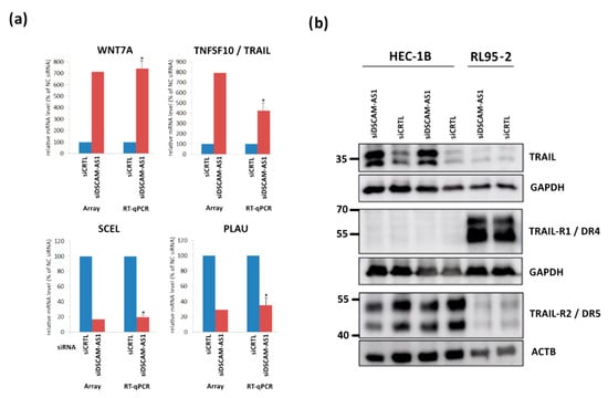 (a) Validation of the microarray results by analyzing expression of the indicated genes after DSCAM-AS1 knockdown by means of RT-qPCR comparing the results of both methods. Total RNA from cells transfected with negative control siRNA (siCTRL, NC) (AM4611, Thermo Fisher) was used as internal control. (b) Western blot analysis of TNFSF10 gene product TRAIL, significantly upregulated on the mRNA level in HEC-1B cells, and of TRAIL receptors DR4 and DR5. Shown are exemplary WB results. As loading controls, housekeeping genes GAPDH and ACTB were analyzed. * p < 0.01 vs. siCTRL.