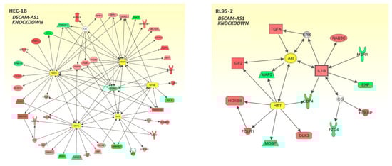 By means of IPA Pathway Analysis software (Qiagen Bioinformatics), we then identified networks connecting genes regulated after DSCAM-AS1 knockdown and their key upstream regulators (Figure 5). Knockdown of this lncRNA by at least 90% (in HEC-1B cells) led to regulation of gene networks controlled by the upstream regulators tumor necrosis factor (TNF), tumor protein 53 (TP53) and by transcription factors MYC and NFκB. The transcriptome of RL95-2 cells was less affected due to insufficient DSCAM-AS1 knockdown resulting from ERα-triggered DSCAM-AS1 induction. Thus, with regard to RL-95-2 cells, the results of Ingenuity pathway analysis (IPA) software (Qiagen) should be assessed with caution. This software suggested AKT Serine/Threonine Kinase 1 to be a central molecule of this network. As important upstream regulators, both the huntingtin (HTT) gene and the upregulated cytokine interleukin 1β (IL1B) were identified, both leading to up- or downregulation of their target genes.
