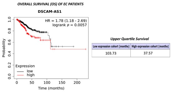 The association of high DSCAM-AS1 levels with poor overall survival (OS) we observed after in silico analysis of open-source data of 543 endometrial cancer patients is in line with similar findings in breast cancer, melanoma, non-small cell lung cancer, colon cancer and osteosarcoma [,,,,,].