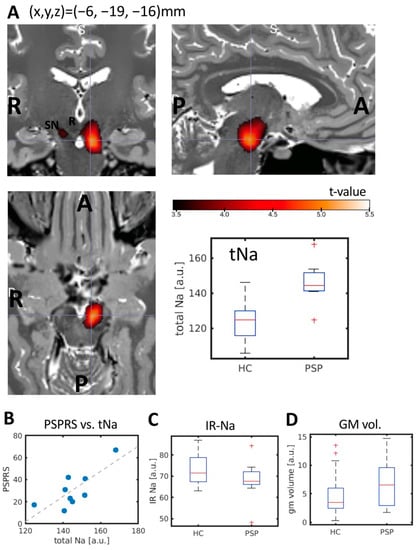 Our results indicate that the increased tNa values were not driven by the rise of intracellular sodium, since the intracellular-weighted sodium signal was not elevated (IR-Na). These findings favor the interpretation of observed tNA changes as being caused by extracellular edema and sodium accumulation, a surrogate marker for overall impaired cell viability, and not as an indirect measure of tau pathology []. The observed changes in total sodium content in the absence of profound morphometric differences could point toward the potential of 23Na-MRI to map neurodegeneration before extensive atrophy already occurred. Therefore, total sodium changes may follow the same patterns implicated for morphometric differences in patients with neurodegenerative diseases. However, longitudinal studies would be needed to confirm this hypothesis by employing tNA and IR-Na-MRI, but could potentially foster the future differential diagnosis between parkinsonian disorders. These findings may point toward tNa-MRI as a more sensitive marker of neurodegeneration preceding the disease phase in which measurable atrophy occurs. However, the cross-sectional design of our study may limit the validity of this interpretation. In an extended case-control study, we have demonstrated the potential of IR-Na MRI in detecting pathophysiological changes in a patient suffering from a mutation in the alpha 3 subunit gene of the sodium/potassium pump (ATP1A3), resulting in a disease named Rapid-Onset Dystonia Parkinsonism [].