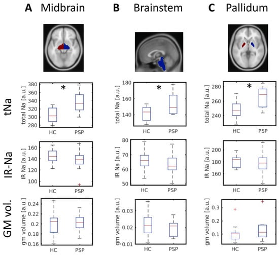Brain regions showing an increased total sodium (tNa) concentration comparing PSP patients and HC (FDR-corrected). Shown are regions of interest according to the Neuromorphometrics Atlas ((A): Midbrain, (B): Brainstem, and (C): Pallidum; top row) and the tNa, IR-Na, and the gray matter volume in the respective regions. a.u.: arbitrary units. GM: gray matter. HC: healthy controls. IR-Na: intracellular-weighted (inversion recovery) 23Na-MRI. PSP: progressive supranuclear palsy. tNa: total sodium weighted 23Na-MRI. *: p ≤ 0.05.