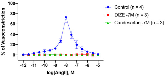 Incubation with candesartan was able to abolish vasoconstriction responses to accumulative doses of AngII when compared to the controls at AngII (10−9 M) (control: 12.69 ± 1.82% vs. candesartan: 0.76 ± 0.31%, * p = 0.0345) to AngII (10−6.5 M) (control: 11.73 ± 5.26% vs. candesartan: 0.17 ± 7.6 × 10−2%, * p = 0.0279) (Figure 2 and Table 1). Strikingly, similar results were seen in the rings incubated with DIZE, as AngII-mediated vasoconstriction was also abolished from AngII (10−9 M) (control vs. DIZE: 0.20 ± 2.00 × 10−3, * p = 0.0267) to AngII (10−6.5 M) (control vs. DIZE: 0.72 ± 0.72%, * p = 0.0377) (Figure 2 and Table 1). Interestingly, no statistically significance differences were observed between DIZE and candesartan at any doses (Table 1). These results suggest the ability of DIZE to inhibit AngII mediated constriction which may be through interaction with AT1R, and is comparable to candesartan, a known and commercially available ARB.