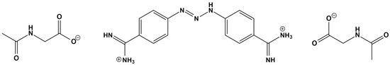 Diminazene reacts with two N-Acetyl glycine (aceturic acid) molecules to afford a salt Diminazene diaceturate. The azene hydrogen is mildly acidic due to the extended aromaticity, which delocalizes the electron pair of nucleophilic nitrogens.