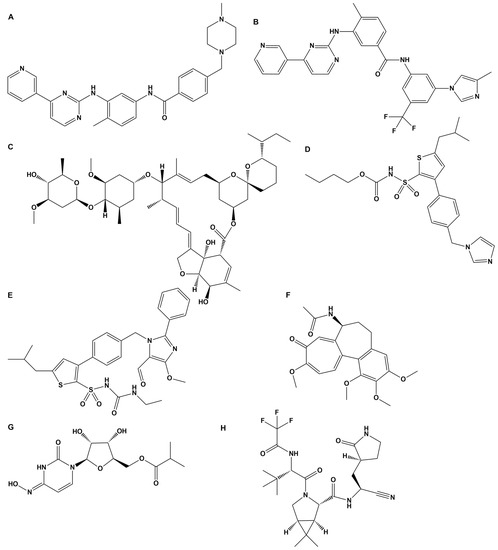 Repurposed and antiviral drugs in the treatment of COVID-19. (A) Chemical structure of imatinib. Imatinib is a specific tyrosine kinase receptor inhibitor that is used in the therapy of Philadelphia chromosome-positive chronic myelogenous leukemia and gastrointestinal stromal tumors. In silico studies have shown that losartan and imatinib are effective against SARS-CoV-2. Its functional groups are NH and NH amide between aromatic rings and may work in a similar way to DIZE [71]. (B) Chemical structure of nilotinib. Nilotinib is an improved analog of imatinib acting at the receptor in a similar way to DIZE. (C) Chemical structure of ivermectin. The FDA-approved drug ivermectin inhibits the replication of SARS-CoV-2 in vitro. The functional groups of ivermectin are the three hydroxyl groups, which may act at the receptor level through their hydroxylates [72]. (D) Chemical structure of Compound 21. Compound 21 is a nonpeptide agonist of heptapeptide Ang(1–7) selective for AT2R and has potential therapeutics for SARS-CoV-2. The functional groups are: (i) NH in between ester and sulfoxide groups attached to the thiophene and (ii) the imidazole group attached to the phenyl group of the template phenyl-thiophene [73]. (E) Chemical structure of AVE0991. AVE0991 is a nonpeptide agonist selective for MAS R, contributing to vasodilation of the RAS system. The functional groups are: (i) NH among the amide and sulfoxide groups attached to thiophene and (ii) the aldehyde group attached to the imidazole ring. It has the structural characteristics of other ARBs. (F) Chemical structure of colchicine. Several early studies have evaluated the benefit of colchicine in COVID-19 patients. Functional groups are: (i) amide NH-CO attached to the hepta ring and (ii) a carbonyl group attached to the aromatic hepta ring. Binding to the receptor may occur through NH of the amide group. (G) Chemical structure of molnupiravir. Merck’s first oral antiviral drug against SARS-CoV-2 infections was approved by the FDA. (H) Chemical structure of PF-07321332. Pfizer’s antiviral drug acts as an orally active 3 CL protease inhibitor. It binds directly to the catalytic cysteine (Cys 145) residue of the cysteine protease. It is a tripeptide mimic suitable for oral administration [74,75].