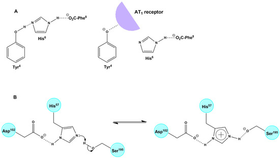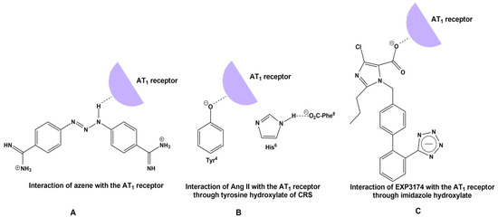 (A) Hypothetical interaction between azene and the receptor paralleled with the interaction of tyrosine hydroxylate of AngII. (B) Interaction of AngII with the receptor through CRS. A charge relay system of AngII demonstrates the interaction between the Tyr4 and His6 side chains and the C-terminal carboxylate of AngII and results in tyrosinate formation and receptor activation [82]. (C) Mechanism of action of Angiotensin II antagonist EXP3174 with its receptor [83].