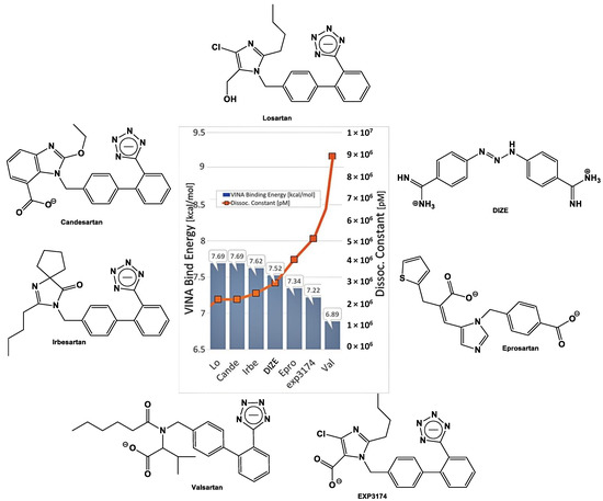 Docking of DIZE and ARBs (Lo, Cande, Irbe, epro, Exp3174 and Val) to the zinc pocket of the SARS-CoV-2 RBD/ACE2 complex. AutoDock VINA-binding energies are illustrated in the central plot with columns. Dissociation constants are represented by the orange line with square markers. Based on the VINA docking metric, the order of binding was: losartan > candesartan > irbesaratan > DIZE > Epro > Exp3174 > valsartan. Abbreviations: Lo, losartan; Cande, candesartan; Irbe, irbesartan and Val, valsartan.
