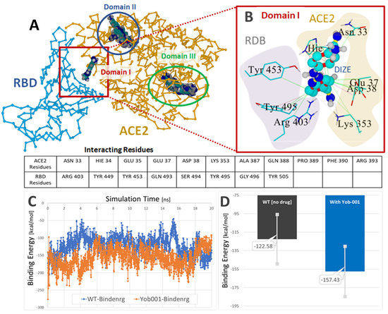 Global docking of DIZE (+2e charge) to the SARS-CoV-2 RBD/ACE2 complex 6LZG. (A) Three docking domains were identified, with DIZE positioned at the RBD–ACE interface in Domain I. The Domain I docking energy was 7.594 kcal/mol with a dissociation constant (Kd) of 2,713,464.75. (B) Principal interactions of DIZE in Domain I at the RBD–ACE2 interface. Hydrophobic interactions (green lines) were predominant between one aromatic ring of DIZE and RBD residues Tyr453, Tyr 495 and Arg403. Additional hydrophobic interactions for this ring involved ACE2 residues Hie34, Asn33, Glu37, Asp38 and Lys 353. Several resonant π–π interactions (red lines) involving both the RBD and ACE2 receptors helped stabilize DIZE in the interfacial pocket. (C) DIZE was stable in the interfacial pocket for at least 20 ns of MD simulation at 311 oK in physiological saline (0.9 wt% NaCl) at pH 7.4. (D) Comparison of the average RBD–ACE2-binding energies for the drug-free 6LZG complex (black bar) and the complex harboring the bound drug (blue bar) calculated over the 20-ns MD simulation. The presence of the drug resulted in a modest (approximately 34 kcal/mol) decrease in the RBD–ACE2-binding energy, suggesting DIZE may interfere with the viral attachment to susceptible host cells.