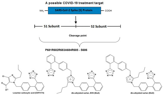 Multi-basic cleavage site of SARS-CoV-2 is a treatment target. Interaction of multi-basic cleavage site (multi-arginines positively charged site) with losartan carboxylic acid (negatively charged) and angiotensin receptor blockers (ARBs). ARBs bear a negative charge (tetrazolate and carboxylate) and may target the positive cavity loop of the spike protein, blocking its entry to ACE2 [94,95,96]. This applies to all ARBs that bear negative charges. Examples of ARBs are bisartans BisA and BisD bearing two tetrazoles, and based on in silico studies, this suggests that it may block ACE2 and prevent hydrolysis of the spike protein by furin and 3CL proteases triggering an infection [49].