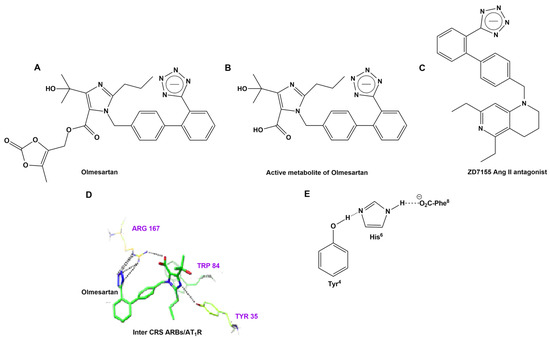 Mutation P681R in the cleavage site 681–686 (PRRARS), detected in the new fatally spreading globally Delta variant, increases the number of arginines (RRRARS), further facilitating cleavage. Sartans, through their negative tetrazolate groups, have an additional receptor binding target, forming salt bridges and, thus, blocking cleavage and, consequently, infection. Moreover, in silico global docking studies have shown that ARBs and DIZE bind to the spike protein RBD/ACE2 complex (Figure 3), with the latter having a greater affinity than EXP3174, valsartan and eprosartan (Figure 10). Figure 12 shows a tentative interaction of multi-basic cleavage site multi-arginines (positively charged) with losartan carboxylic acid (negatively charged) and ARBs. ARBs bear a negative charge (tetrazolate and carboxylate) and may target the positive cavity loop of the spike protein, blocking its entry to ACE2 [94]. This applies to all ARBs, as they all bear negative charges. Figure 13 shows the structures of olmesartan, the active metabolite of olmesartan, and the ZD7155 AngII antagonist. Interactions between AT1R and olmesartan were determined by the crystal structure. The critical interactions of olmesartan are with R167, W84 and Y35 residues of AT1R (Figure 13A) [33,65]. The intra-CRS interactions in AngII are shown in Figure 13 [67,82].
