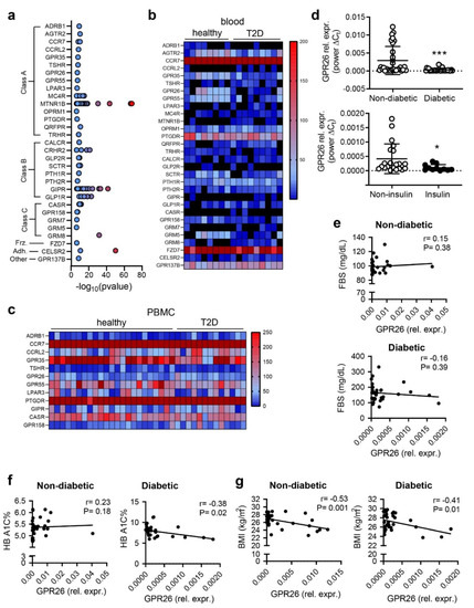 3.2. GPR26 Is down Regulated in the PBMC from Diabetic Patients and Negatively Correlates with Their BMI, HbA1c, and Insulin