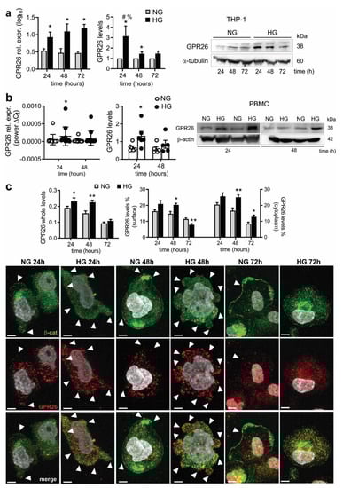 3.3. Hyperglycemia Upregulated GPR26 in PBMC and THP-1 Cultured Cells