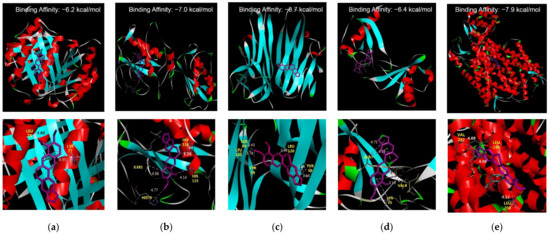 BBR showed high-affinity binding to five receptors (M1, M2 macrophages, TNF-α, CCL2, and CXCR4) (Figure 2a–e). BBR much strongly docked to M2 macrophage by −7.0 kcal/mol, to TNF-α by −8.7 kcal/mol, and to CXCR4 by −7.9 kcal/mol.