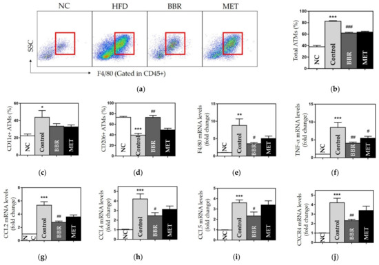 The population and polarization of ATMs and the gene expressions of chemokines. (a) Flow cytometry results and gating strategy of CD45+ & F4/80+ ATMs (red box); the populations of (b) CD45+ & F4/80+ ATMs; (c) CD11c+ ATMs; (d) CD206+ ATMs; and the gene expressions of (e) F4/80; (f) TNF-α; (g) CCL2; (h) CCL4; (i) CCL5; and (j) CXCR4. Data are presented as mean ± standard error of the mean (SEM). * p < 0.05, ** p < 0.01 and *** p < 0.001 vs. the NC group and # p < 0.05, ## p < 0.01 and ### p < 0.001 vs. the control group. ATMs: adipose tissue macrophages, NC: normal chow, HFD: high fat diet, BBR: berberine, MET: metformin, TNF-α: tumor necrosis factor α, CCL2: C-C motif chemokine ligand 2, CCL4: C-C motif chemokine ligand 4, CCL5: C-C motif chemokine ligand 5, CXCR4, C-X-C motif chemokine receptor 4.