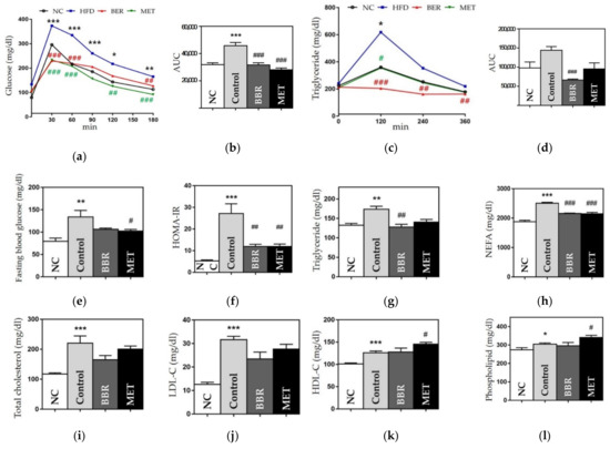Glucose- and lipid metabolism-related outcomes. (a) OGTT results, (b) AUC of OGTT, (c) OFTT results, (d) AUC of OFTT, (e) fasting blood glucose, (f) HOMA-IR (g) triglycerides (h) NEFA, (i) total cholesterol level, (j) LDL cholesterol level, (k) HDL cholesterol level, and (l) phospholipid level. Data are presented as mean ± standard error of the mean (SEM). * p < 0.05, ** p < 0.01 and *** p < 0.001 vs. the NC group and # p < 0.05, ## p < 0.01 and ### p < 0.001 vs. the control group. AUC: area under curve, OGTT: oral glucose tolerance test, OFTT: oral fat tolerance test, HOMA-IR, homeostatic model assessment for insulin resistance, NEFA: non-esterified fatty acid, LDL: low-density lipoprotein, HDL: high-density lipoprotein NC: normal chow, HFD: high fat diet, BBR: berberine, MET: metformin.