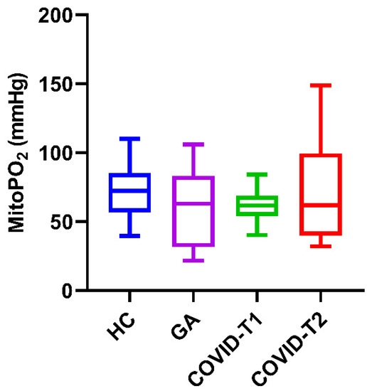 MitoPO2 (mmHg) in HC, COVID-19 patients on T1 and T2, and general anesthesia group. HC = healthy controls, T1 = time point 1, T2 = time point 2, and GA = general anesthesia. Values are displayed as median with interquartile range (box) and minimum and maximum (whiskers).