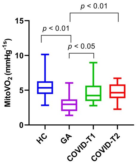 MitoVO2 (mmHg/s) in HC, COVID-19 patients on T1 and T2, and the general anesthesia group. HC = healthy controls, T1 = time point 1, T2 = time point 2, and GA = general anesthesia. Values are displayed as median with interquartile range (box) and minimum and maximum (whiskers).