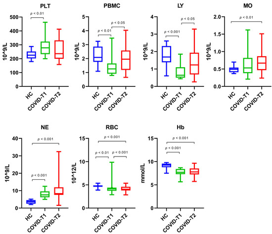 Whole blood cell counts for platelets (PLT), PBMC, lymphocytes (LY), monocytes (MO), neutrophils (NE), red blood cells (RBC), and Hb levels for the healthy control (HC), COVID-T1, and COVID-T2 groups.