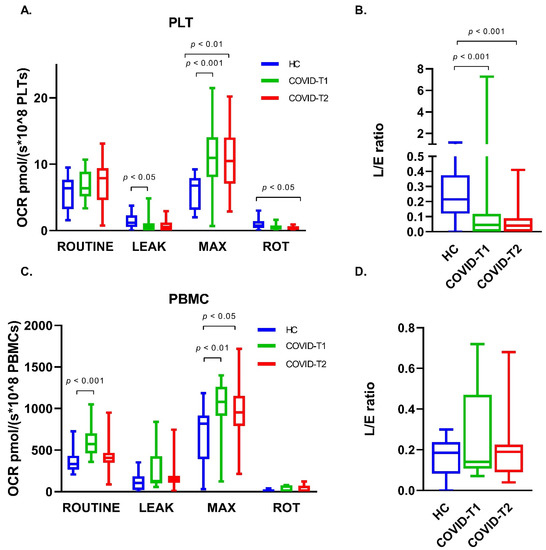 Oxygen consumption rate (OCR) for ROUTINE, LEAK, maximal respiration (MAX), and respiration after inhibition of complex I by rotenone (ROT) in (A) platelets and (C) PBMC. LEAK/ET coupling control ratio (L/E Ratio) in (B) platelets and (D) PBMC for the healthy control (HC), COVID-T1, and COVID-T2 groups. Values displayed as median ± min/max values.