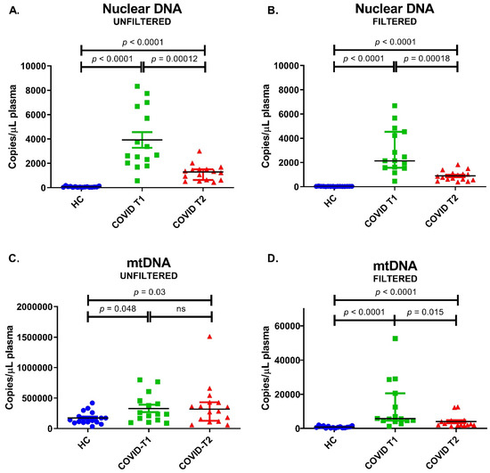Plasma amount of nuclear DNA (β-globin) and mitochondrial DNA (mtDNA) in HC = healthy controls, COVID-T1, and COVID-T2 groups. (A) Unfiltered nuclear DNA amount. (B) Filtered nuclear DNA amount. (C) Unfiltered mtDNA. (D) Filtered mtDNA. Values are displayed as median ± IQR.