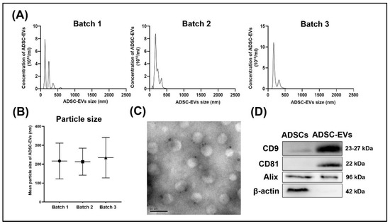 Characterization of ADSC-EVs. ADSC-EVs were isolated from three separate batches of conditioned media (CMs) and characterized. (A) Particle size distribution of ADSC-EVs measured through a nanoparticle tracking analysis (NTA). (B) Mean particle sizes of ADSC-EVs measured through NTA. Data are presented as the mean ± standard deviation (SD; n = 3). (C) Morphology of the ADSC-EVs as observed through transmission electron microscopy. (D) Western blot analysis of the protein levels of CD9, CD81, Alix, and β-actin in ADSCs and ADSC-EVs.