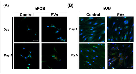 Exosomes and microvesicles are two key types of EVs used in tissue engineering [3]. Studies have demonstrated that EVs are instrumental in cell-to-cell communication [61,62]. EVs can act directly bind to specific cells [63]; they also act as paracrine signaling factors that can alter the functions of a neighboring or distant target cell [64]. To test the effect of ADSC-EVs on osteoblasts, we first investigated the uptake of the ADSC-EVs by osteoblasts and the subsequent cellular responses. Through coculturing of the ADSC-EVs with hFOBs and hOBs, we discovered that the uptake of the ADSC-EVs by the hFOBs and hOBs occurred on day 5 (Figure 2). These results suggest that the cell-to-cell communication between ADSCs and osteoblasts occurs through the delivery of ADSC-EVs to osteoblasts in ADSC-based BTE.