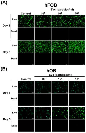 Effect of ADSC-EVs on the survival of osteoblasts. The hFOBs (A) and hOBs (B) were treated with ADSC-EVs at concentrations of 0 (Control: control group) or 109 particles/mL (EVs: EV group) for 5 days and analyzed for survival. Live/dead cell assays were performed for hFOBs and hOBs to determine the cell survival on days 1 and 5. Green fluorescence indicates live cells (Live), whereas red fluorescence indicates dead cells (Dead). The hFOBs and hOBs remained alive on days 1 and 5 after the ADSC-EV treatment.