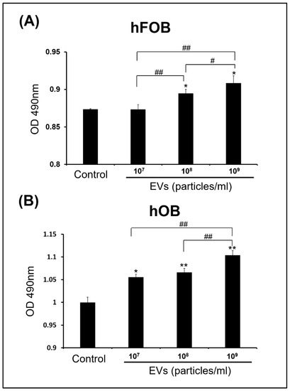 Effect of ADSC-EVs on the proliferation of osteoblasts. The hFOBs (A) and hOBs (B) were treated with ADSC-EVs at concentrations of 0 (Control: control group) or 1 × 107–1 × 109 particles/mL (EVs: EV group) for 5 days and analyzed for cell proliferation. MTS assays were performed for hFOBs and hOBs on day 5 to determine the cell proliferation. Cell proliferation of hFOBs and hOBs was enhanced after the ADSC-EV treatment. Data are presented as the mean ± SD (n = 6). * p < 0.05 and ** p < 0.01 for comparisons with the control group. # p < 0.05 and ## p < 0.01 for comparisons between the two groups.