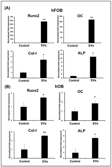 ADSC-EVs promoted osteogenic marker gene expression in osteoblasts. The hFOBs (A) and hOBs (B) were treated with ADSC-EVs at concentrations of 0 (Control: control group) or 109 particles/mL (EVs: EV group) for 5 days. The mRNA expression levels of the osteogenic marker genes (runt-related transcription factor 2 (Runx2), osteocalcin (OC), collagen type I (Col-I), and alkaline phosphatase (ALP)) of hFOBs and hOBs were measured. Gene expression levels are expressed relative to the control group, which is defined as 1. Data are presented as the mean ± SD (n = 3). * p < 0.05 and ** p < 0.01 for comparisons with the control group.