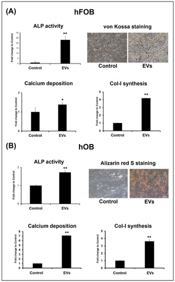 ADSC-EVs promote ALP activity, calcium deposition, and collagen type I (Col-I) synthesis in osteoblasts. The hFOBs (A) and hOBs (B) were treated with ADSC-EVs at concentrations of 0 (Control: control group) or 1 × 109 particles/mL (EVs: EV group) for 12 days and analyzed through von Kossa staining, Alizarin red S staining and quantification, and ELISA for ALP activity and Col-I synthesis. Data are presented as the mean ± SD (n = 3). * p < 0.05 and ** p < 0.01 for comparisons with the control group.