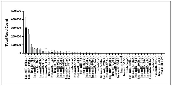 EVs are regarded as the regulators of cell-to-cell communication, which is achieved through the transfer of lipids, nucleic acids (mRNAs and miRNAs), and cell-specific proteins to recipient cells to elicit the cellular responses of the recipient cells [61,62]. miRNAs are a class of small, noncoding RNA molecules that function as negative regulators of gene expression at the posttranscriptional level [70]. EVs can modulate recipient cells through the miRNA regulation of posttranscriptional coding genes [71]. Therefore, we analyzed and profiled the miRNAs of ADSC-EVs on the basis of the total read count. The three most abundant miRNAs in the ADSC-EVs were discovered to be hsa-miR-151a-3p, hsa-miR-148a-3p, and hsa-let-7i-5p (Figure 7). Among these three miRNAs, miR-151a-3p and miR-148a-3p were reported to regulate osteoblast activity [72,73], and let-7i-5p was shown to promote the osteogenic differentiation of MSCs [74]. These results suggest that ADSC-EVs enhance osteoblast functions and that their miRNA may contribute to the effect.