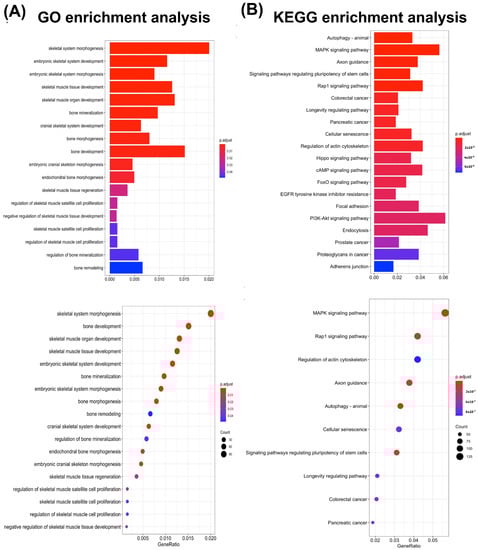 We performed GO pathway and KEGG pathway analyses for miRNAs enriched in ADSC-EVs to clarify their possible molecular mechanism. The GO analysis indicated that skeletal system morphogenesis and bone development were enriched pathways (Figure 8A). The KEGG pathway analysis revealed that autophagy, the MAPK signaling pathway, and the Rap-1 signaling pathway may make contributions (Figure 8B). Osteoblast autophagy is involved in mineralization and bone homeostasis [75]. MAPK was revealed to play a key role in skeletal development and bone homeostasis, which particularly affect osteoblast differentiation [76]. Of the three classic MAPKs, the p38 and ERK activity levels are crucial in determining and shaping the skeleton [76]. The Rap-1 pathway may also make a contribution; one study reported that RAP-1A is a key regulator in osteoblast differentiation because of the phosphorylation of ERK and P38 expression [77]. Among the three most abundant miRNAs detected in the ADSC-EVs, miR-151 regulates the autophagy process [78], miR-148a-3p was demonstrated to be involved in osteoblast differentiation [79], and miRNA let-7i-5p was reported to be a positive regulator of bone development [80]. Our results suggested that ADSC-EVs influence osteoblast functions through factors including autophagy, the MAPK signaling pathway, and the Rap-1 signaling pathway. Although we showed that ADSC-EVs enhance the osteoblast functions and that their miRNAs may contribute to the effects, whether these miRNAs influence osteoblastic functions through autophagy, MAPK signaling, or Rap-1 signaling has not yet been fully clarified. Further in-depth investigations are necessary regarding the molecular mechanism of the miRNAs carried by ADSC-EVs in relation to osteoblastic functions.