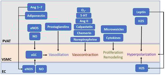 It is currently known that PVAT exerts anticontractile function on the adherent blood vessel through secretion of various PVAT-derived relaxing factors (PVRFs), previously known as the adventitia-derived relaxing factors (ADRFs) []. Potential PVRFs include leptin and adiponectin [], H2S [], hydrogen peroxide (H2O2) [], prostaglandins [,], NO [], and angiotensin (Ang) 1–7 []. In addition to PVRFs, recent studies have revealed that PVAT can secrete contracting factors (PVCFs) that modulate vasoconstriction [,,]. Potential PVCFs include chemerin [], calpastatin [], 5-hydroxytryptamine (5-HT) [], norepinephrine (NE) [], AngII, and ROS []. Although the detailed mechanisms of how PVRFs and PVCFs exert their effects on the blood vessel remain unclear, it is hypothesized that PVAT modulates vascular functions through two distinct mechanisms: endothelium-dependent and endothelium-independent pathways [,]. These factors from PVAT may reach the endothelial layer of blood vessels by either direct diffusion or via vasa vasorum or small media conduit networks connecting the medial layer with the underlying adventitia [,,] (Table 1). In addition, the same factors from PVAT can act as either PVRFs or PVCFs. For example, H2S and prostanoids in PVAT have anticontractile effects under normal conditions, while they can induce contractile responses under disease conditions [].