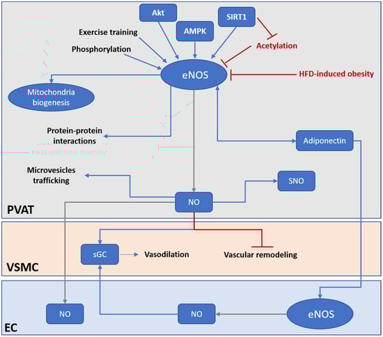 Another important function of PVAT eNOS is to stimulate the expression of adiponectin, which is an important adipokine that contributes to vasodilation regulation, anti-inflammation, and inhibition of VSMCs proliferation and migration [,]. eNOS has been shown to regulate adiponectin synthesis in adipocytes by increasing mitochondrial biogenesis and enhancing mitochondrial function []. PVAT-derived adiponectin may regulate endothelial functions, partly by enhancing eNOS phosphorylation in the endothelium []. Indeed, the function of PVAT is determined by the browning and inflammation status. Mitochondrial biogenesis is involved in the browning of adipocytes []. Fitzgibbons et al. proposed that promoting the browning of PVAT might confer a protective effect to attenuate the development of vascular diseases []. PVAT eNOS may have a vital role in the mitochondrial biogenesis and browning of PVAT []. However, the detailed mechanisms underlying browning or thermogenesis of PVAT are barely known.