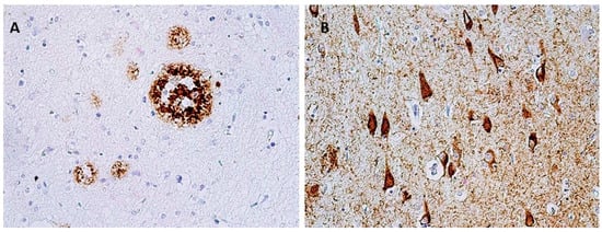 Neuropathological finding showing changes in Alzheimer’s disease. (A) Senile plaques in temporal cortex, immunohistochemically stained with β-amyloid antibodies, magnification 400×; (B) Neurofibrillary tangles, pretangles, and numerous threads in hippocampus, stained with monoclonal antibody (AT8) against phosphorylated tau protein, magnification 400×.
