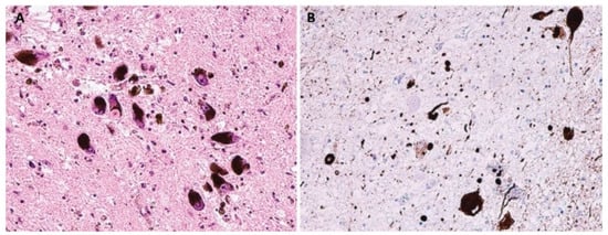Neuropathological finding showing changes in Parkinson’s disease. (A) Lewy body in a pigmented neuron substantia nigra, H&E staining, original magnification 200×; (B) The spectrum of α-synuclein pathology in pons. Lewy bodies, neuronal granular cytoplasmic positivity and dystrophic neurites, stained with anti- α-syn monoclonal antibody, original magnification 200×.