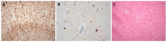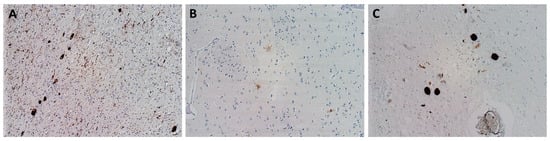 Among non-tau FTLD, the most common present deposits are those of TDP-43 protein (Figure 5); deposits of ubiquitin or FUS protein are rarer. Based on this, groups are then further referred to as TDP-43 proteinopathies (FTLD-TDP), ubiquinopathies (FTLD-U), and FUS proteinopathies (FTLD-FUS) [].