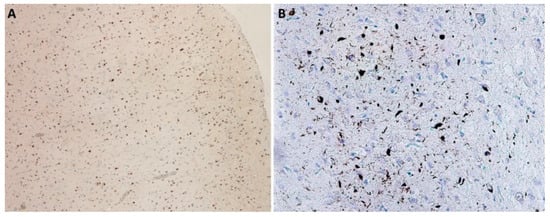 Neuropathological finding showing changes in FTLD-TDP. (A) Temporal cortex, numerous neuronal cytoplasmic inclusions in all layers of neocortex, stained with monoclonal antibody (phospho-TDP-43) against hyperphosphorylated TDP-43 protein, original magnification 40×; (B) cytoplasmic inclusions in residual neurons nuclei nervi hypoglossi, stained with monoclonal antibody (phospho-TDP-43) against pathologically changed TDP-43 protein, magnification 200×.