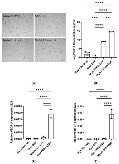 Additionally, we performed qPCR to analyse hVEGF and hFGF4 expression in the Myo (control), Myo-GFP, Myo-VEGF-GFP, and Myo-FGF4-VEGF cell lines to confirm altered gene expression. qPCR indicated a significant upregulation of hVEGF expression in Myo-VEGF-GFP and Myo-FGF4-VEGF cell lines compared to non-transfected and Myo-GFP cell lines which resulted in undetermined products. A modest increase of hVEGF was seen in the Myo-VEGF-GFP cell line. Meanwhile, a much more apparent increase was seen with the Myo-FGF4-VEGF cell line compared to Myo (control) and Myo-GFP cell lines (p < 0.0001) (Figure 1C). hFGF4 expression in the Myo-FGF4-VEGF cell line was also highly detected compared to Myo (control), Myo-GFP, and Myo-VEGF-GFP (p < 0.0001) cells (Figure 1D), confirming the dual expression of both hFGF4 and hVEGF-A in this cell line. These data further confirmed the initial ELISA results, supporting the findings that stably transfected cell lines express significant levels of hVEGF-A alone, or in combination with hFGF4, respectively.