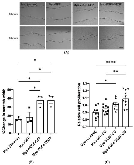 Endothelial cell migration (Scratch) assay was carried out as described previously [45,46]. C166 cells (ATCC, #CRL-2581) were seeded in a 12-well plate at a density of 0.2 × 106 cells/well and left overnight. A P200 pipette tip was used to scratch horizontally across each well, followed by a wash with PBS to remove cell debris, and conditioned media from Myo (control) or Myo-GFP, Myo-VEGF-GFP and Myo-FGF4-VEGF cells were applied. Scratches were imaged using EVOS M5000 at 10X magnification and then returned to the incubator at 37 °C for 8 h before being imaged again. Cell migration was quantified by the change in width of the scratch between experimental time points, with the distance measured using Image J software (Version 1.52a, U. S. National Institutes of Health, Bethesda, MD, USA. https://imagej.nih.gov/ij/, accessed on 8 April 2019).