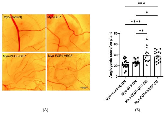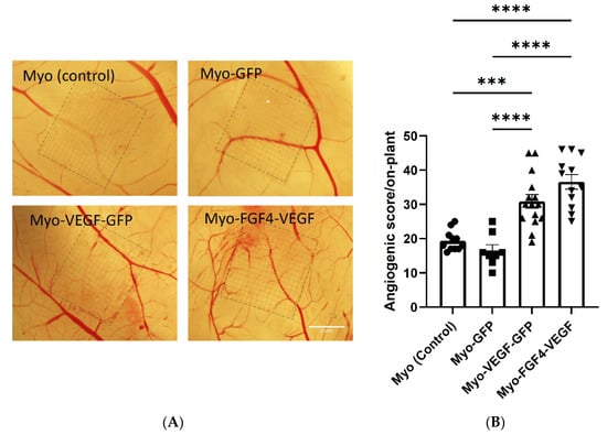 The present findings are promising, confirming that Myo-VEGF-GFP and Myo-FGF4-VEGF cell lines secrete elevated levels of hVEGF and have the potential to induce angiogenesis in vivo. Naturally, the next phase would be to examine the applicability and efficacy both these cell lines could have in a higher in vivo mouse model of disease. Myoblast transplantation is a promising area of therapeutics [87]; however, it can encounter several biological setbacks in their survival and propagation [18,88]. Therefore, in order to confirm the continued biological activity of these cell lines, the application of the cells directly was carried out, again using the CAM assay as an in vivo model of angiogenesis.