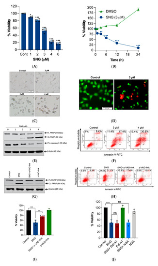 SNG-induced cell death is associated with features of apoptosis. HeLa cells were treated with (A) indicated concentrations of SNG for 6 h and (B) 3 μM SNG for the indicated time period. Cell viability was measured using an MTT assay. Data shown are means ± SD (n = 3) (* p < 0.05, ** p < 0.01, and *** p < 0.001) vs. the respective control. Cells were treated with indicated concentrations of SNG for 6 h. Following treatment, (C) morphological changes were assessed by microscopy, (D) live-dead assay was performed, and a (E) Western blot analysis of indicated proteins was performed. Actin was used as the loading control, and (F) apoptosis analysis by flow cytometry was done using Annexin V-FITC/PI staining. HeLa cells pretreated with z-VAD-fmk were treated with SNG (3 μM) for 6 h. Following treatment, (G) Western blot analysis of indicated proteins was performed. Actin was used as a loading control, (H) apoptosis analysis by flow cytometry using the Annexin V-FITC/PI staining, and (I) cell viability was assessed by the MTT assay. Data shown are mean ± SD (n = 3). ** p < 0.01 and *** p < 0.001. (J) HeLa cells were pretreated with Baf A1 or NSA were treated with SNG (3 μM) and cell viability was measured by the MTT assay. Data shown are mean ± SD (n = 3). *** p < 0.001. ns, no significance.