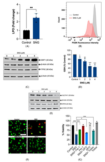GSH is a physiologically defensive molecule that prevents LPO. GSH depletion is considered as the onset cause of ferroptosis [19]. SNG treatment significantly reduced GSH levels in HeLa cells (Figure 2D). SLC7A11 is a crucial constituent of the cystine/glutamate antiporter (system Xc−), which typically mediates the inflow of extracellular L-cystine, which is important for GSH synthesis [19]. Glutathione peroxidase 4 (GPX4) is a selenoenzyme responsible for diminishing phospholipid hydroperoxide through the oxidation of GSH [19]. It has been indicated that disturbed system Xc− or GPX4 leads to ferroptosis. Therefore, the expressions of the SLC7A11 and GPX4 levels were tested. As shown in Figure 2E, SNG significantly reduced SLC7A11 levels with a negligible impact on the expression of GPX4. Collectively, these data suggest that SNG induces the features of ferroptosis through SLC7A11 downregulation, GSH reduction, labile iron pool accumulation, and LPO, which are the characteristic features of ferroptosis. Moreover, pretreatment with Fer-1 and Trolox (LPO inhibitors), and DFO (an iron-chelating agent), partially, but significantly, inhibited SNG-induced cytotoxicity in HeLa cells, suggesting that SNG, apart from inducing apoptosis, can also induce ferroptosis in HeLa cells (Figure 2F,G).