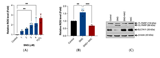 Extensive evidence in the literature validates that ROS can effectively induce cell death, such as apoptosis and ferroptosis [12]. Several lines of evidence in our study demonstrate that ROS plays a vital role in SNG-induced death in human cervical cancer cells. First, SNG induces rapid ROS generation. Second, pretreatment of cells with ROS scavengers almost completely abolishes SNG-induced PARP cleavage, SLC7A11 down-regulation, and LPO. Third, the cytotoxic effect of SNG is significantly abolished in the presence of ROS scavengers. We also identified specific ROS responsible for the SNG-induced cytotoxicity. Pretreatment with specific H2O2 scavengers (Sod-Py and Cat) provided significant protection from loss of viability, PARP cleavage, and SLC7A11 down-regulation, but the O2—scavenger (SOD) failed to do so.