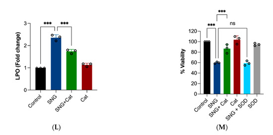 GSH levels were determined as detailed in the instructions from the manufacturer’s protocol. Briefly, SNG-treated cells were lysed in 150 μL of lysis buffer (5% sulfosalicylic acid). The lysates were centrifuged, and 50 μL of supernatant was mixed with 150 μL of assay buffer (potassium phosphate buffer, pH 7.0, containing 5 mM EDTA, 1.5 mg/mL DTNB (5,5′-dithiobis-(2-nitrobenzoic acid), and 6 U/mL glutathione reductase). To this mixture, 50 μL of (0.16 mg/mL) NADPH (nicotinamide adenine dinucleotide phosphate) in a potassium phosphate buffer was added, and the absorbance was measured at 412 nm using an EnSpire™ multimode plate reader (PerkinElmer, Waltham, MA, USA).