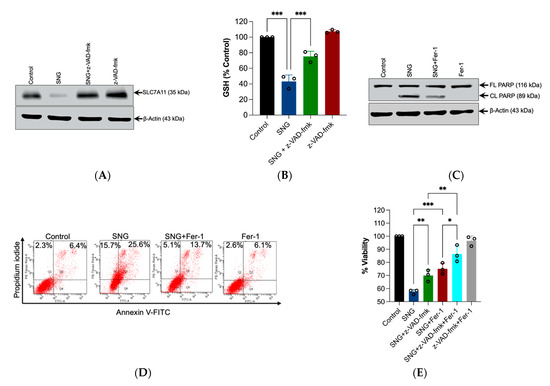 Crosstalk between apoptosis and ferroptosis in SNG-induced cell death. Cells were treated with SNG (3 μM) in the presence or absence of z-VAD-fmk for 6 h. Following treatment, (A) Western blot analysis of the indicated proteins were performed. Actin was used as a loading control and the (B) GSH levels were measured. Data shown are means ± SD (n = 3) (*** p < 0.001). Cells were treated with SNG (3 μM) in the presence or absence of Fer-1 for 6 h. Following treatment, (C) Western blot analysis of the indicated proteins was performed and actin was used as the loading control, (D) apoptosis was analyzed by Annexin V-FITC/PI staining. (E) The cells were treated with SNG (3 μM) in the presence or absence of a combination of z-VAD-fmk and Fer-1 for 6 h. Following treatment, cell viability was assessed using an MTT assay. Data shown are means ± SD (n = 3) (* p < 0.05, ** p < 0.01, and *** p < 0.001).